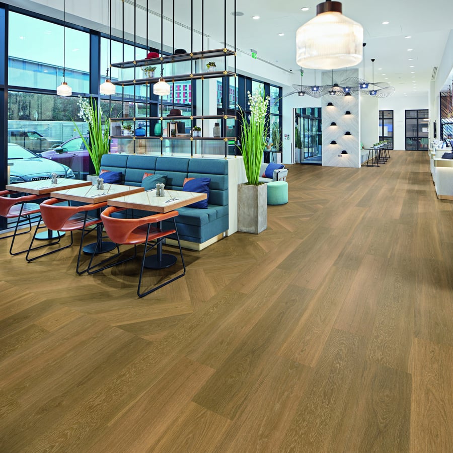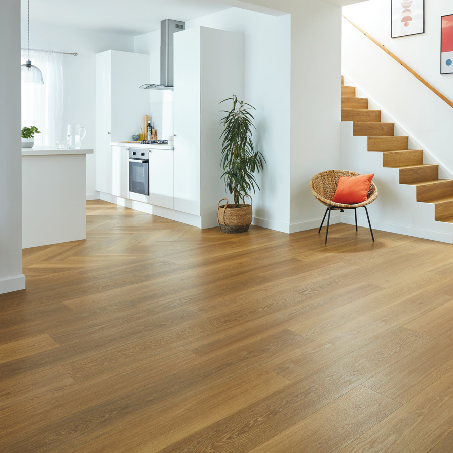 Van Gogh Golden Brushed Oak – tai šilto, medaus atspalvio ir švelnių tonų europinis ąžuolas. Puikus pasirinkimas įvairiems komerciniams ir privatiems interjerams. Pasižymi natūralios medienos tekstūros reljefu, kuris dar labiau pabrėžia autentišką estetiką, įkvėptą originalios medienos.