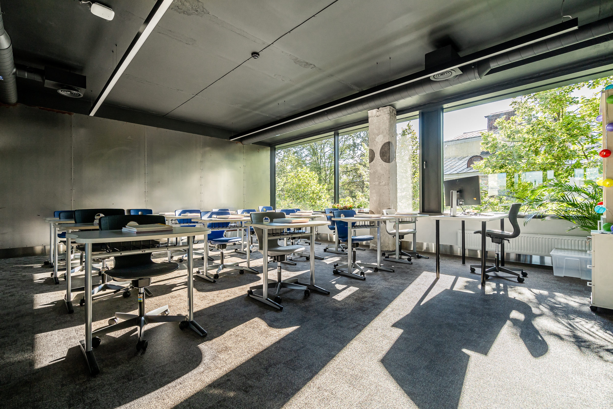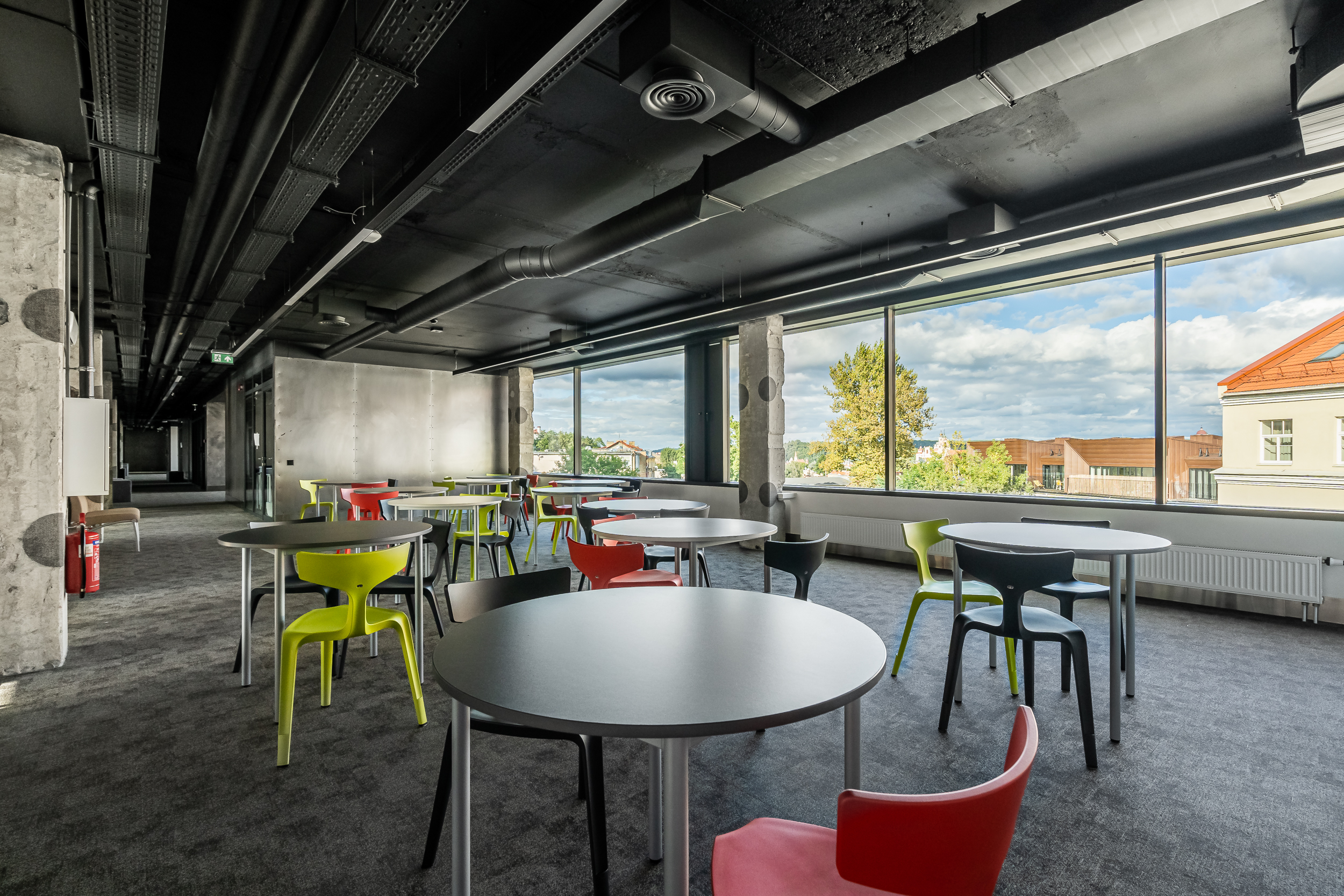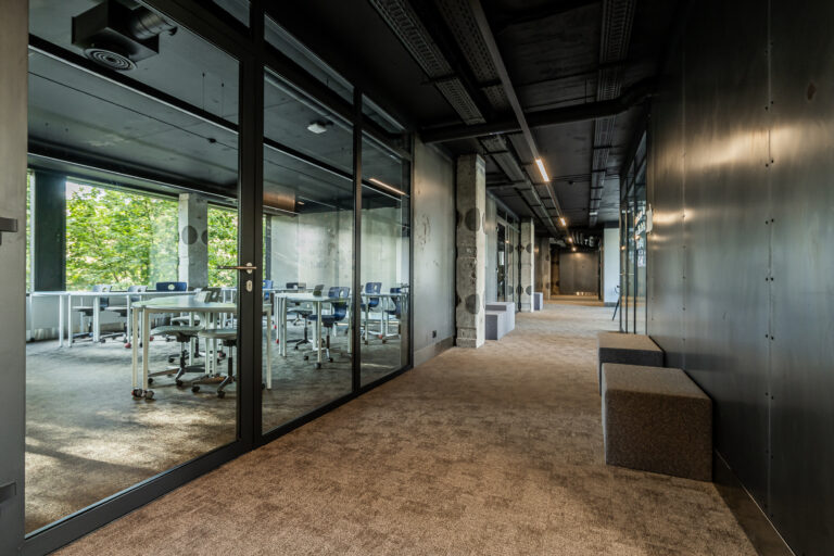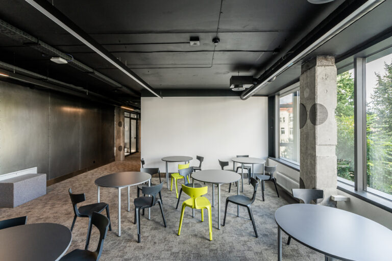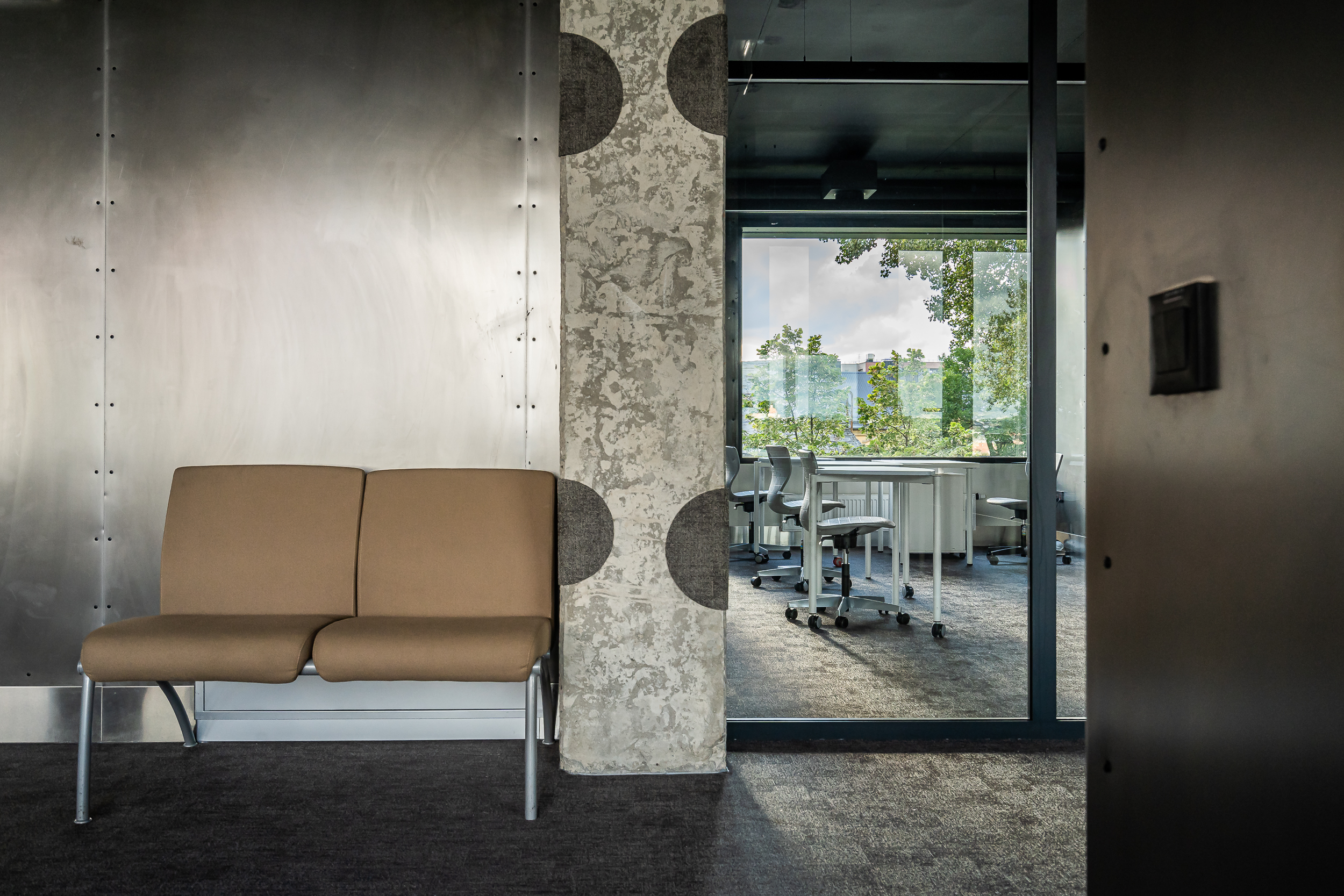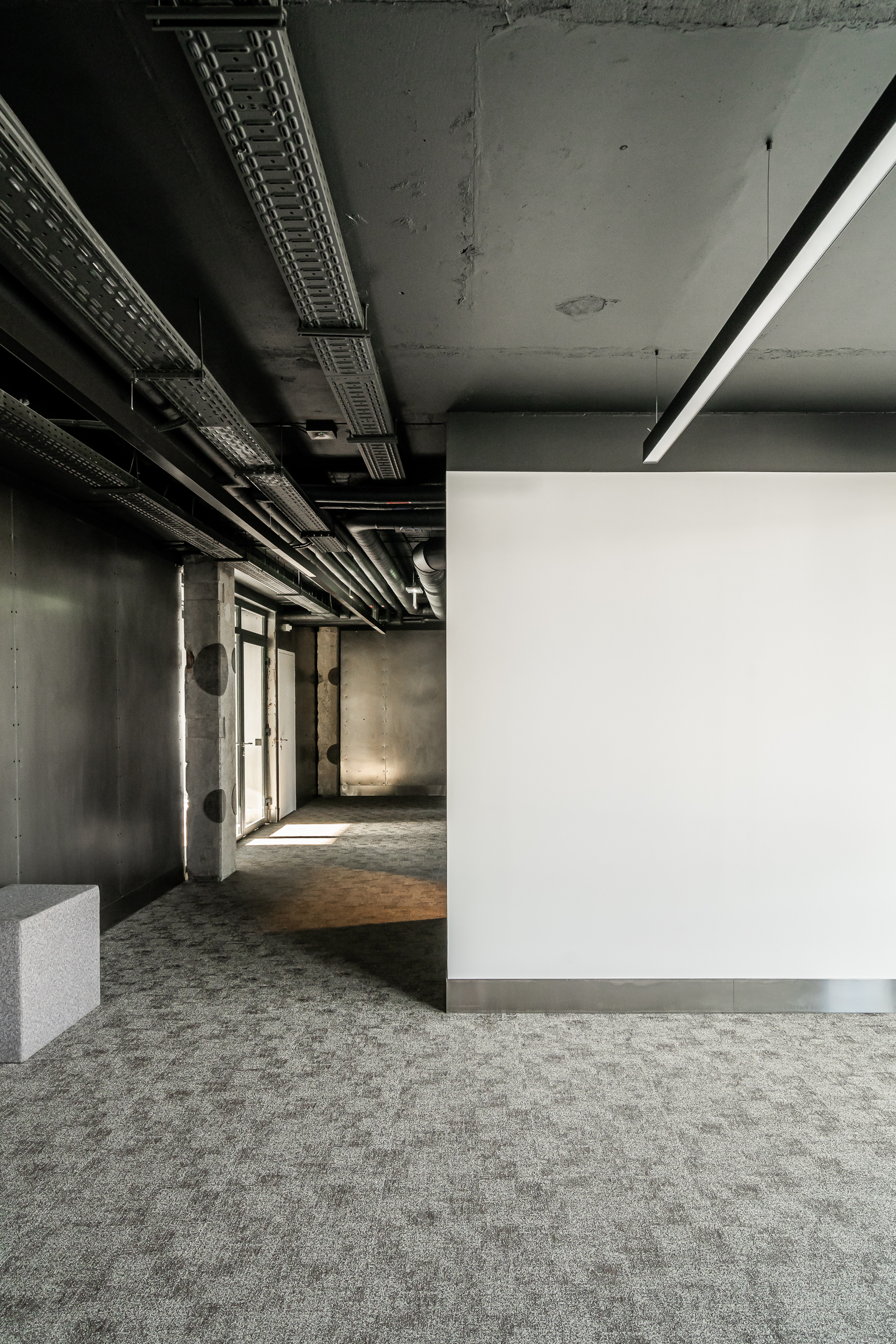 Architektų pasirinktas variantas grindims – jau daugiau nei 18 mūsų atstovaujama austa vinilinė danga 2TEC2. Funkcionali, estetiška ir šešėliais žaisminga 2TEC2 danga net ir įrėminta šaltų sienų lubų kontekste, sukuria jaukumą aplinkai, kurioje norisi kurti ir išreikšti savo individualumą.