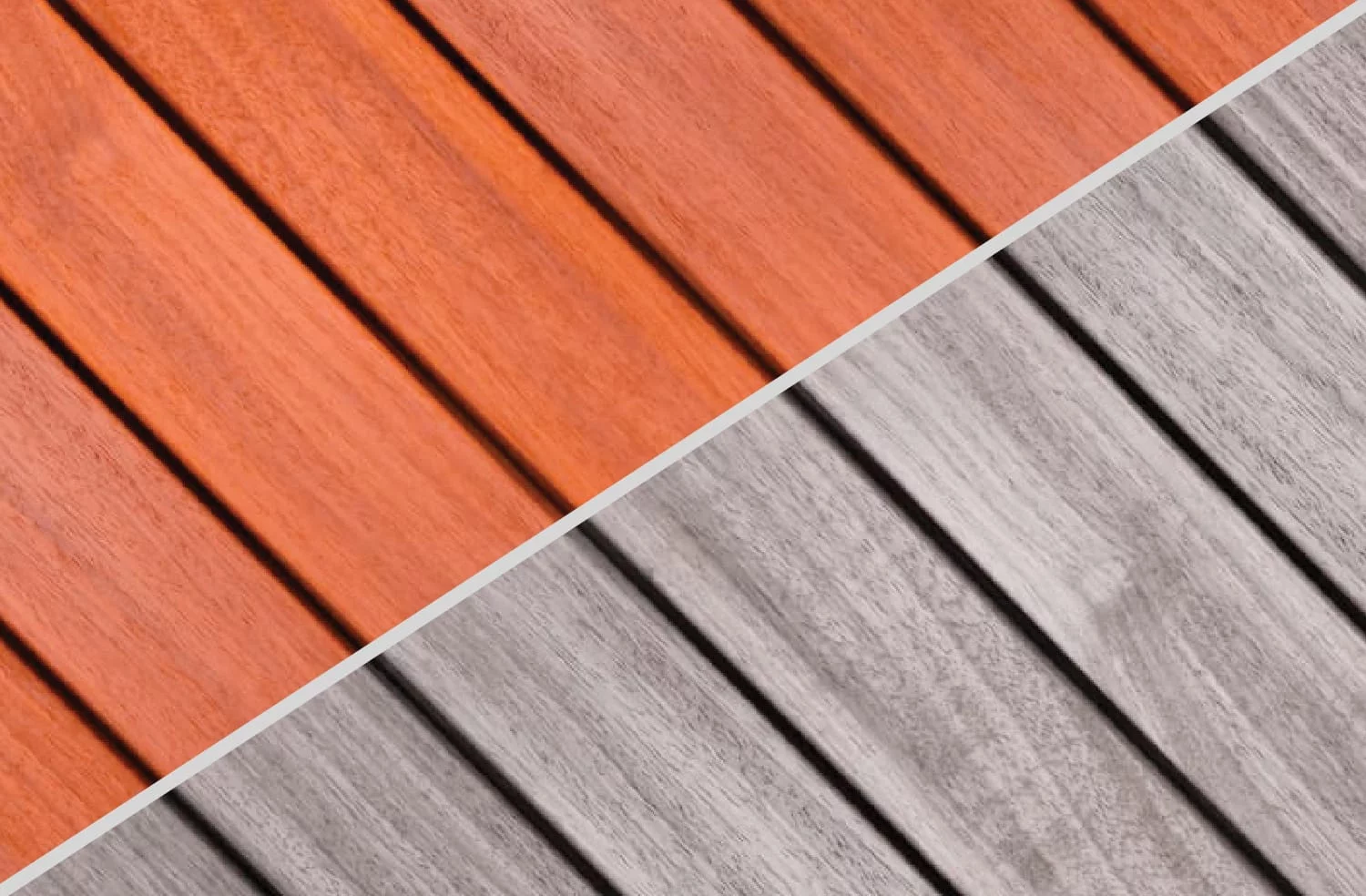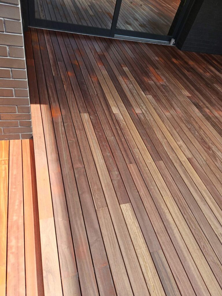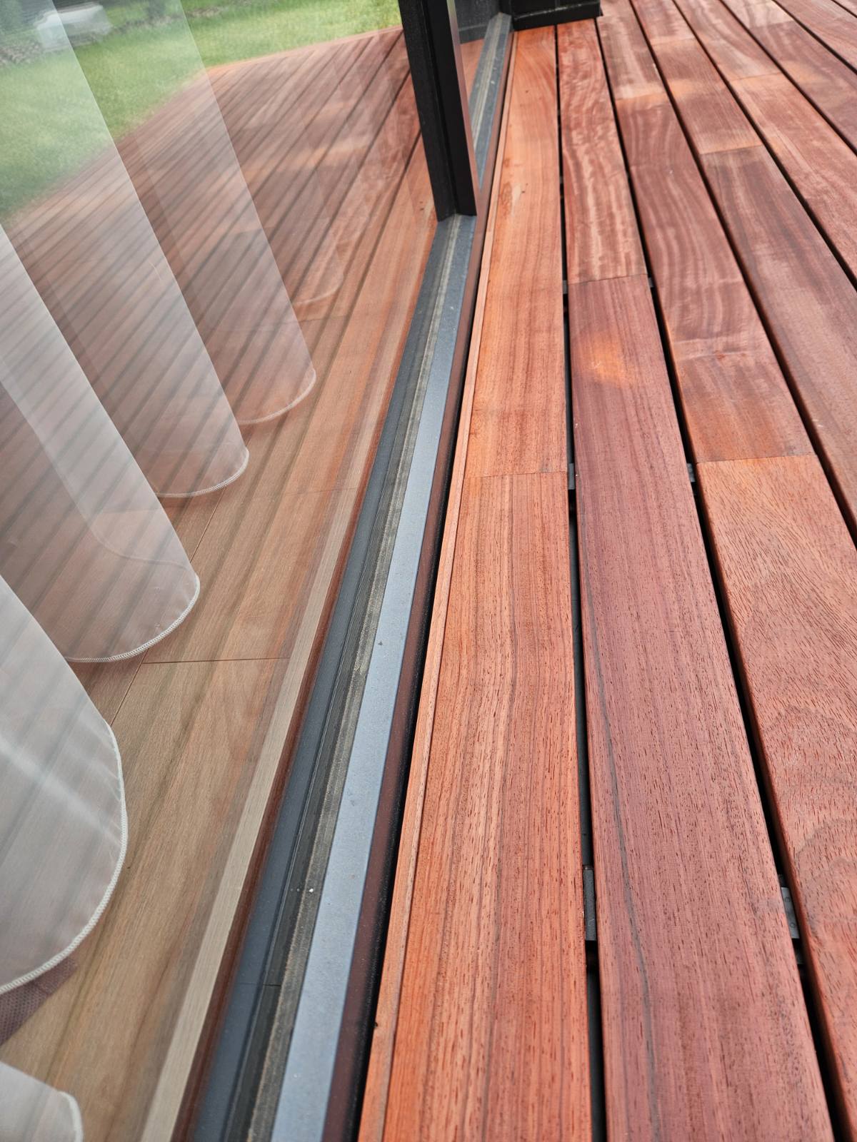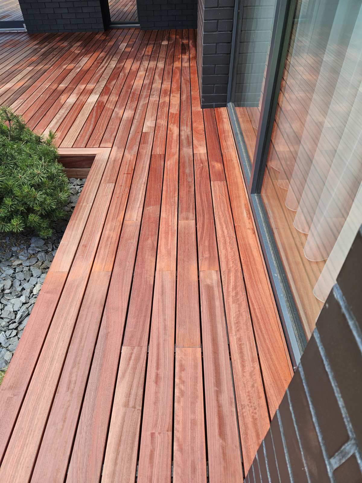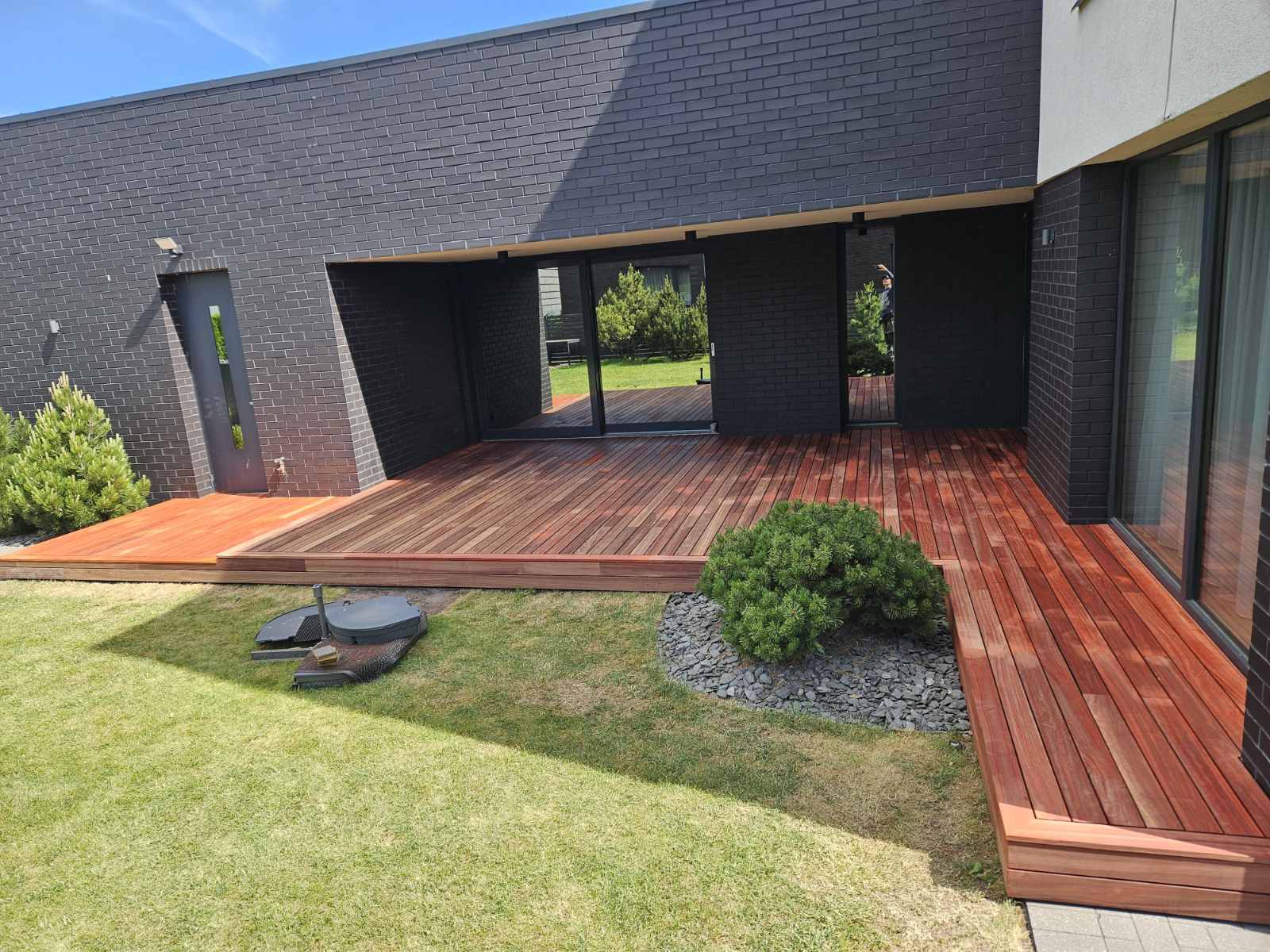 Terasų sistema Softline siūlo tik pirmos klasės Padouk medieną, todėl ši terasa atrado itin tvarkingai ir estetiškai. Laiko eigoje medienos spalva patampa sidabriškai pilka.
