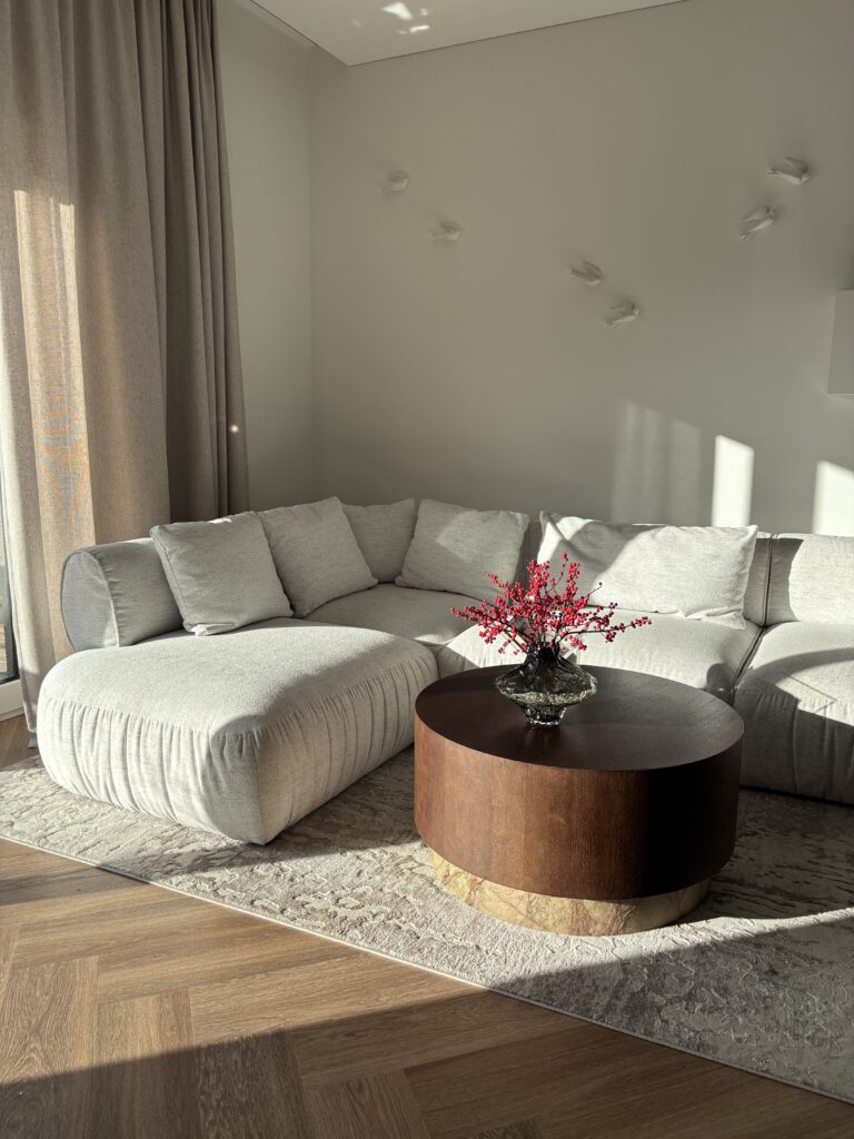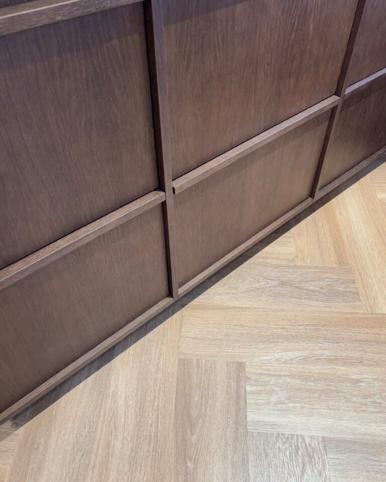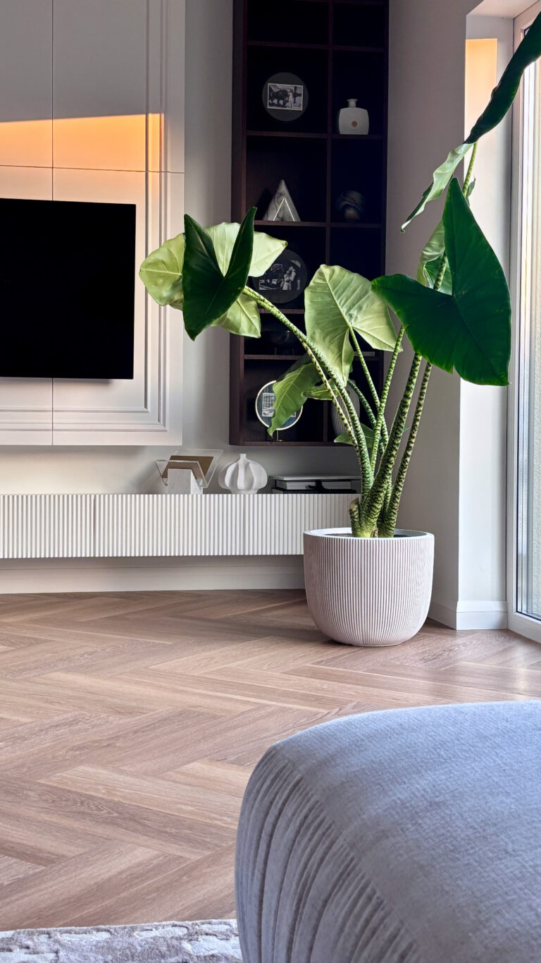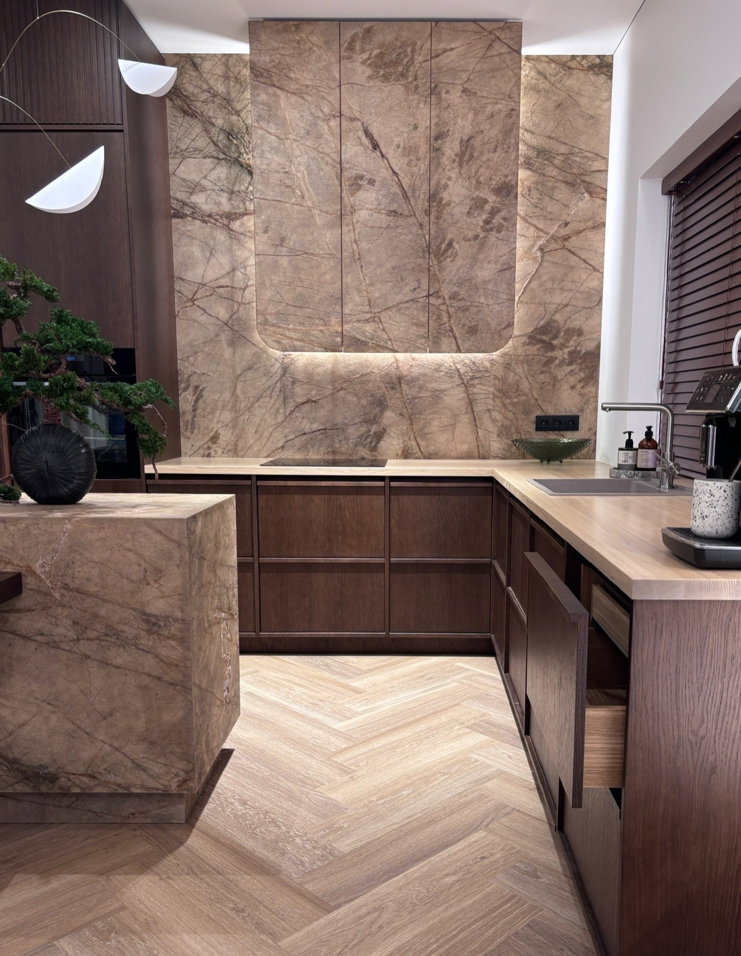 Modernus ir elegantiškas interjeras, kuriame dera tamsaus medžio baldai ir akmens akcentai. Grindims parinktos šiltos ąžuolo spalvos vinilinės lentelės, klotos eglute, suteikia erdvei jaukumo, natūralumo ir harmoningai papildo bendrą interjero estetiką.