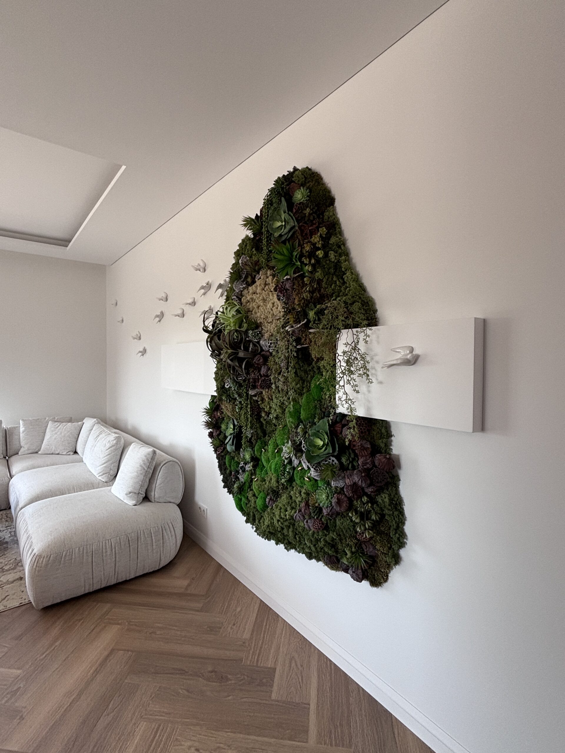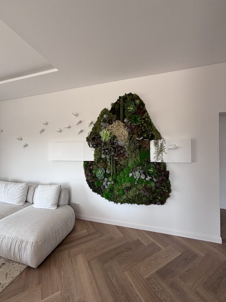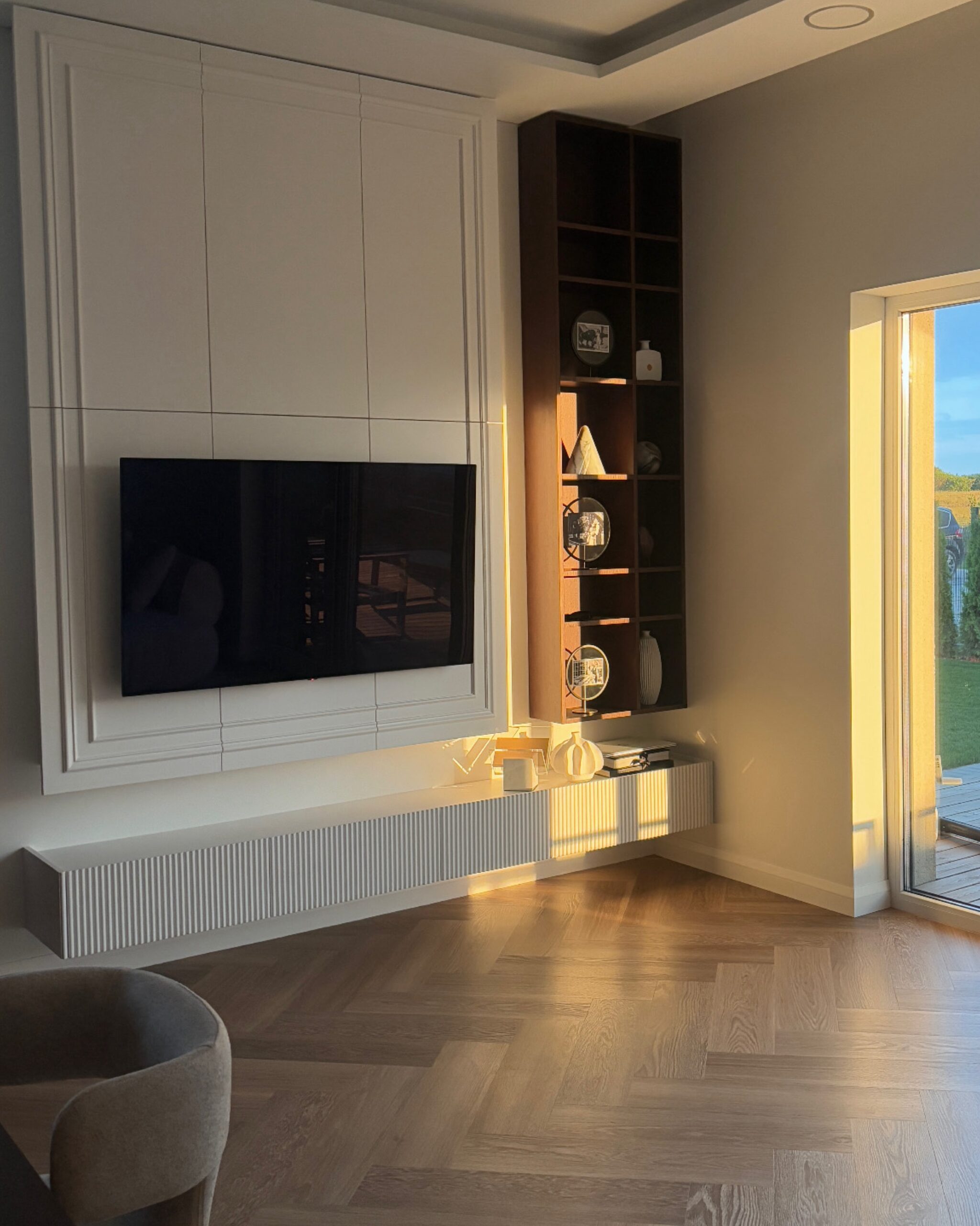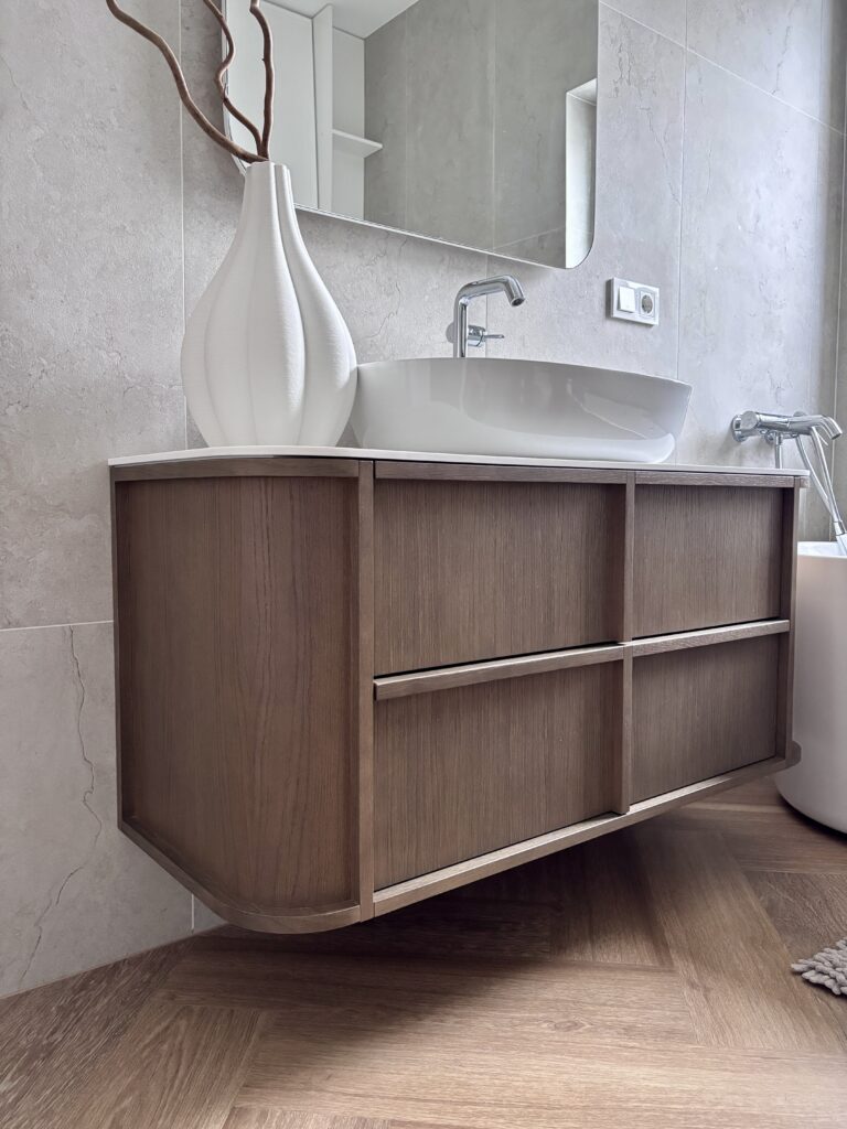 Modernus ir elegantiškas interjeras, kuriame dera tamsaus medžio baldai ir akmens akcentai. Grindims parinktos šiltos ąžuolo spalvos vinilinės lentelės, klotos eglute, suteikia erdvei jaukumo, natūralumo ir harmoningai papildo bendrą interjero estetiką.